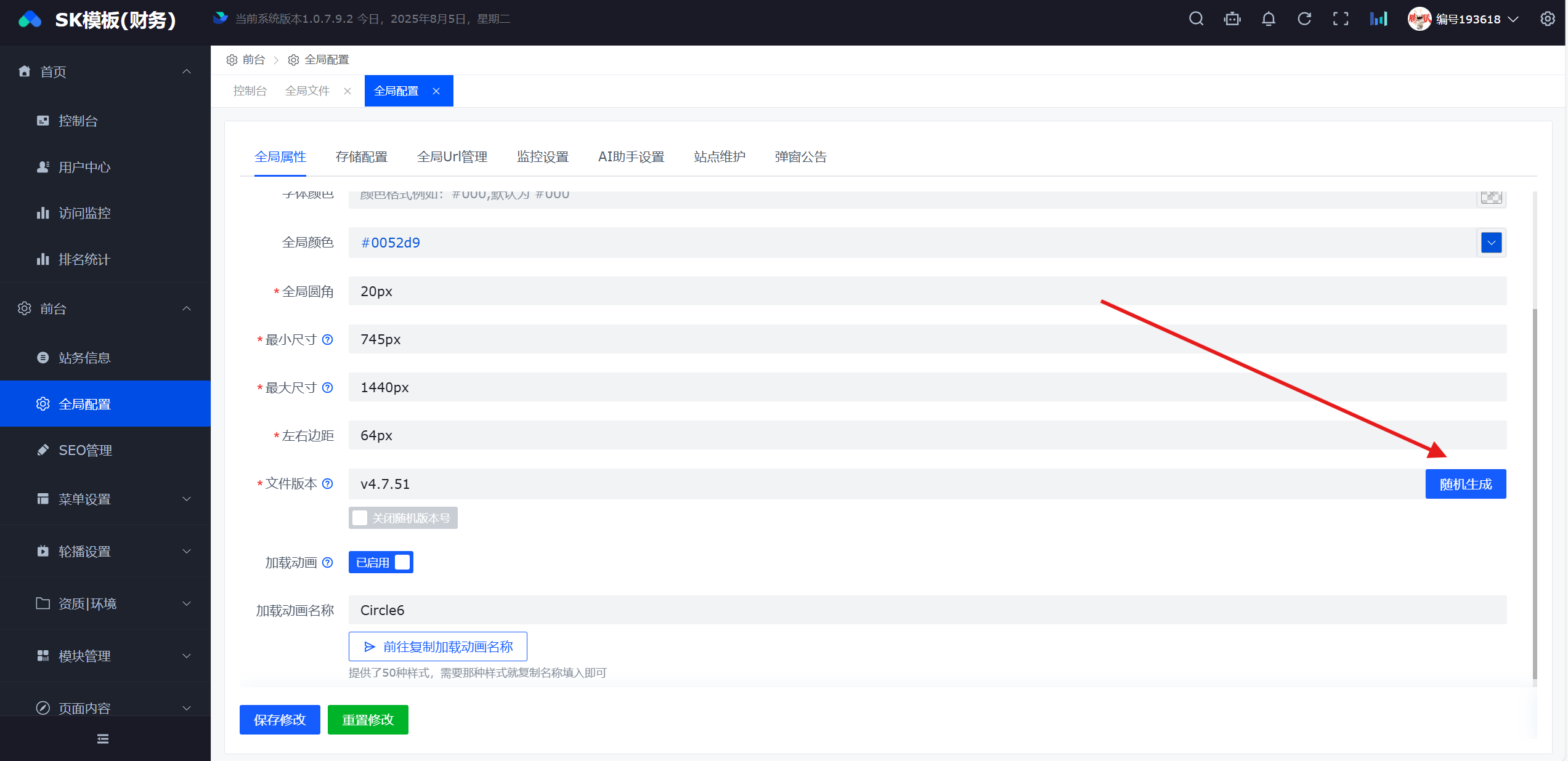 3.我们在菜单栏的前台-全局配置里重置版本号